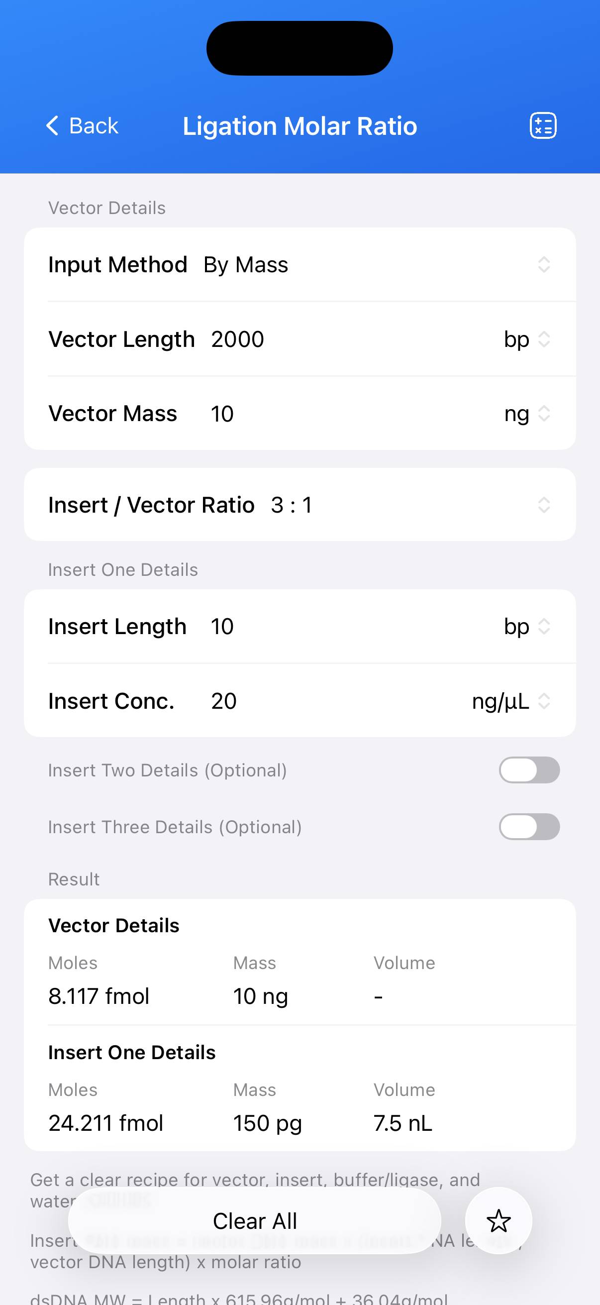 Enter the desired Insert:Vector molar ratio (e.g., 3:1). The calculator determines the required amount of each insert in both picomoles (pmol) and nanograms (ng). - Precise Volume Calculation: