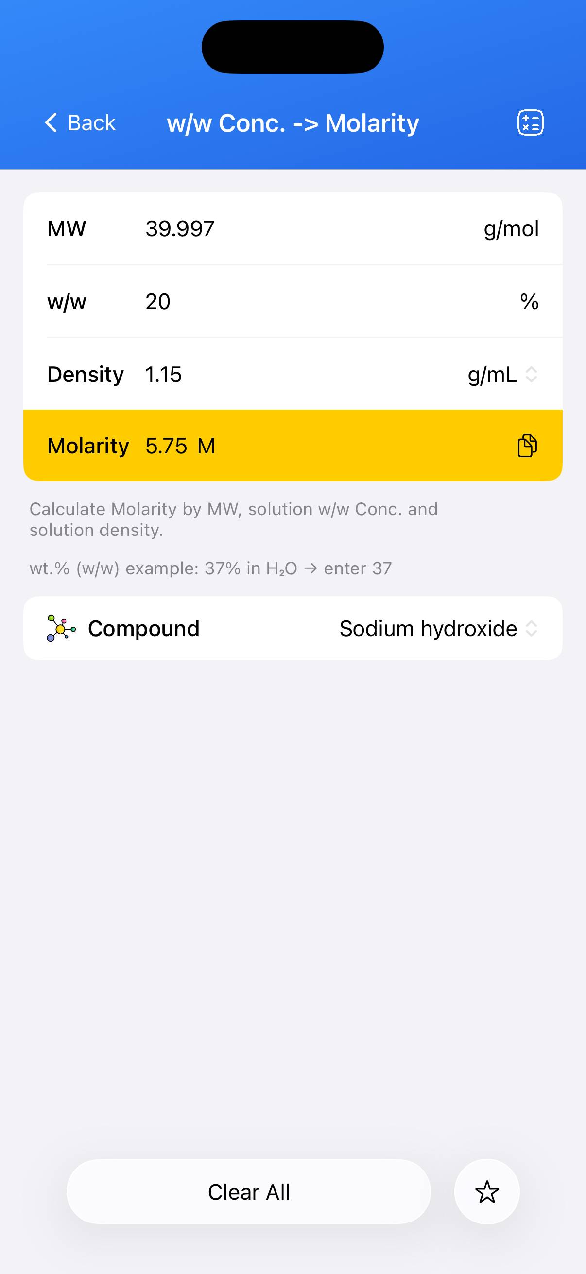 Calculates molarity directly from w/w concentration, solution density, and molecular weight. - Convenient compound selection: