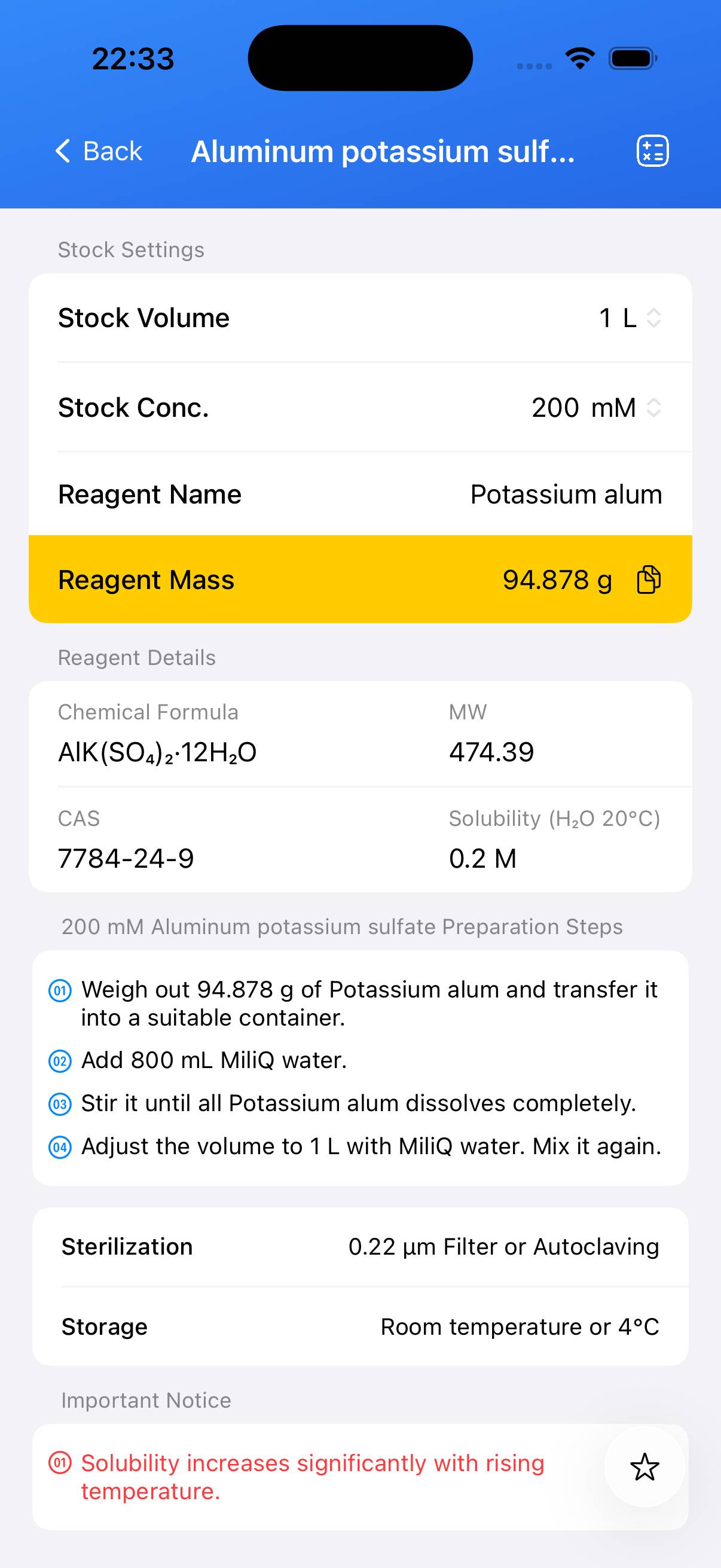 Potassium alum (aluminum potassium sulfate dodecahydrate) is a crystalline inorganic salt that dissolves readily in water to form acidic solutions. It is commonly used in analytical chemistry, water treatment, and as a reagent in laboratory protocols. The hydrated form with 12 molecules of water (KAl(SO₄)₂·12H₂O, MW = 474.39 g/mol) is preferred for solution preparation because it is stable and easy to weigh.