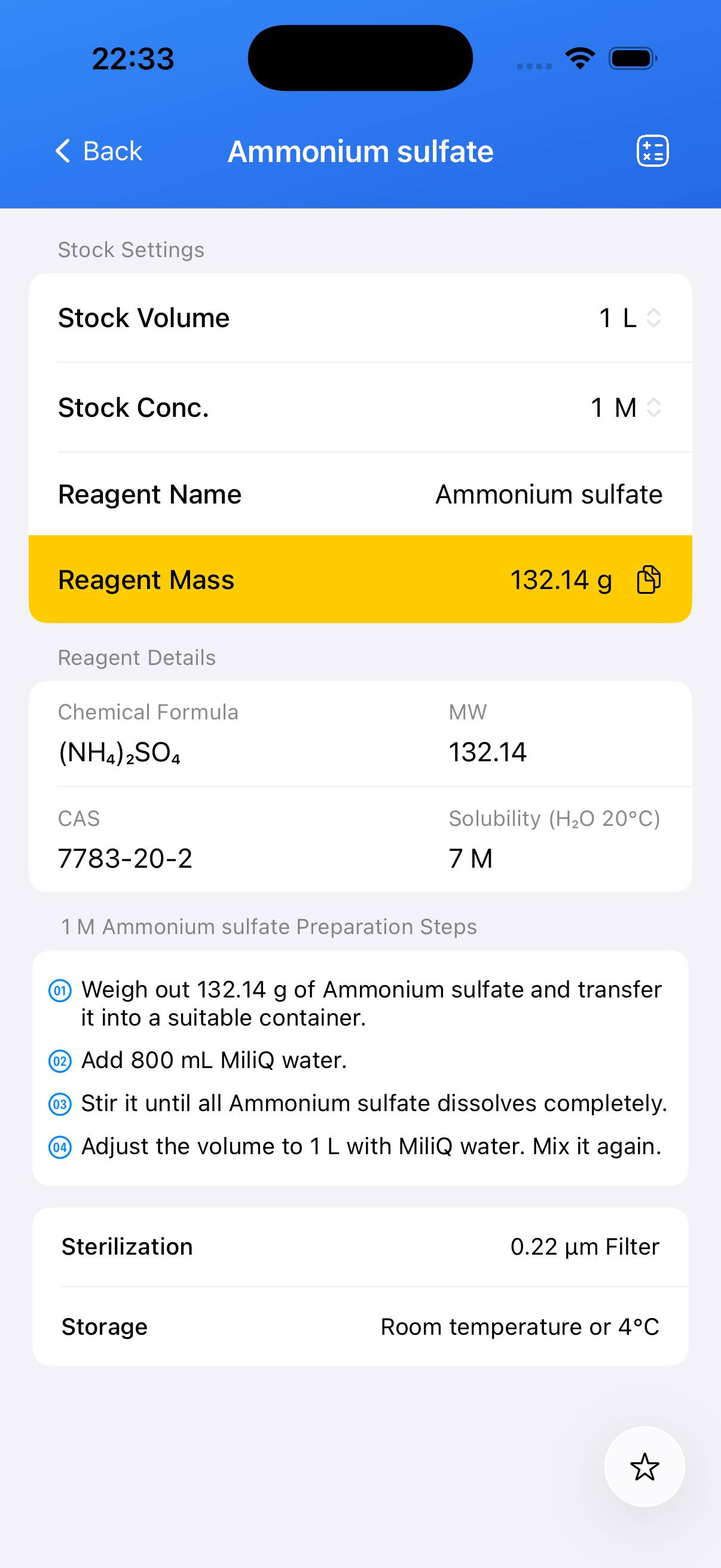 Decide the target concentration (e.g., 1 M). For a 1 M solution: dissolve **132.14 g** of ammonium sulfate in water and dilute to **1 L** total volume. Adjust the mass proportionally for other final volumes (e.g., 13.214 g for 100 mL of 1 M solution). - Step 2