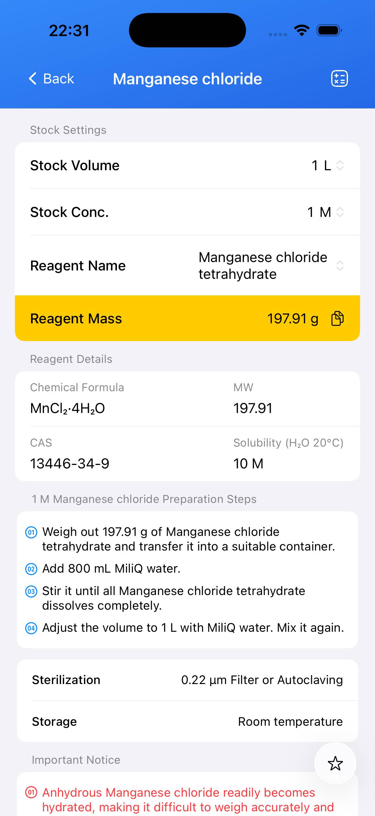 This guide describes the preparation of Manganese chloride Stock Solution at a defined molarity for laboratory use.