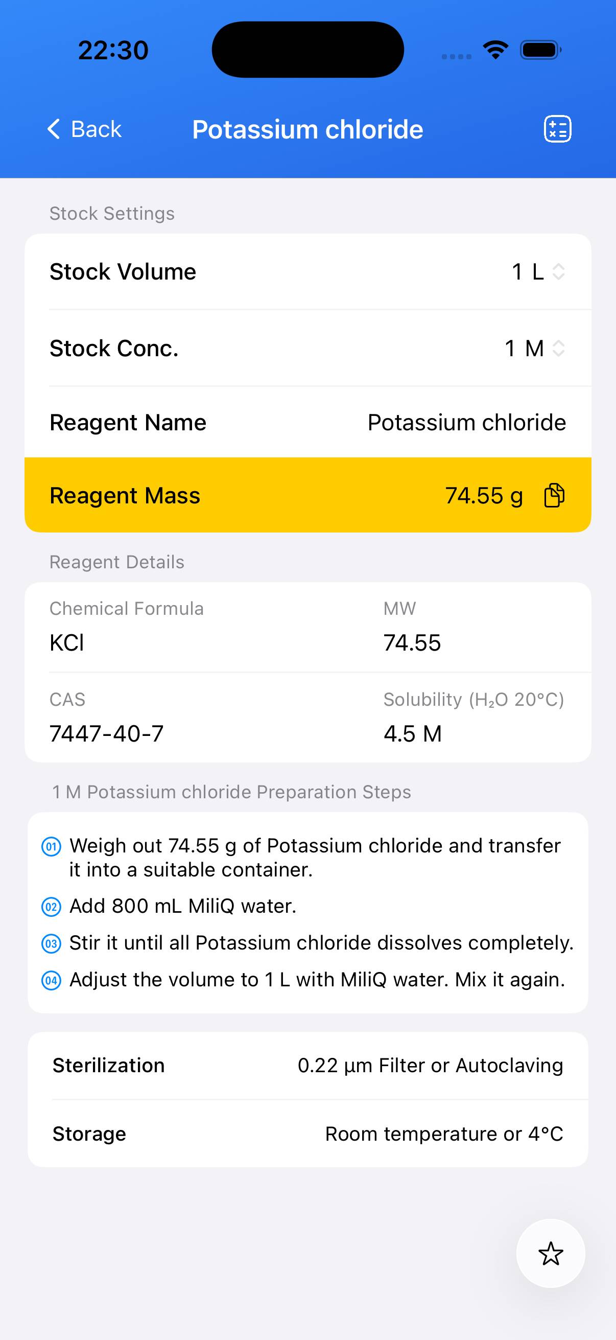 - Mix the solution thoroughly. The 1 M KCl stock is ready for use.