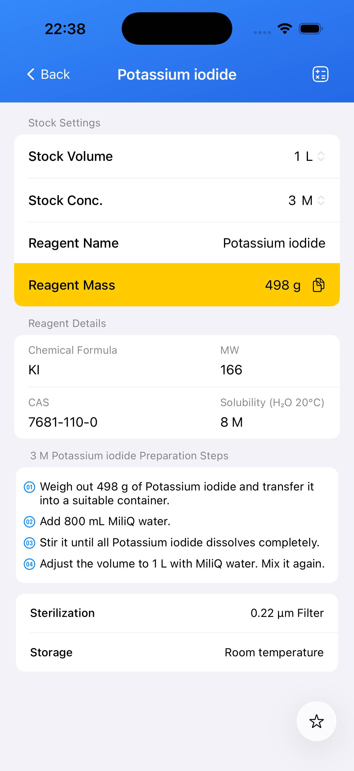 Decide the target molarity for your stock solution. For example, to prepare **1 M** KI stock: weigh **166 g** of potassium iodide (MW ≈ 166 g/mol) for **1 L** of solution. Scale proportionally for other volumes (e.g., **16.6 g** for 100 mL of 1 M). - Step 2