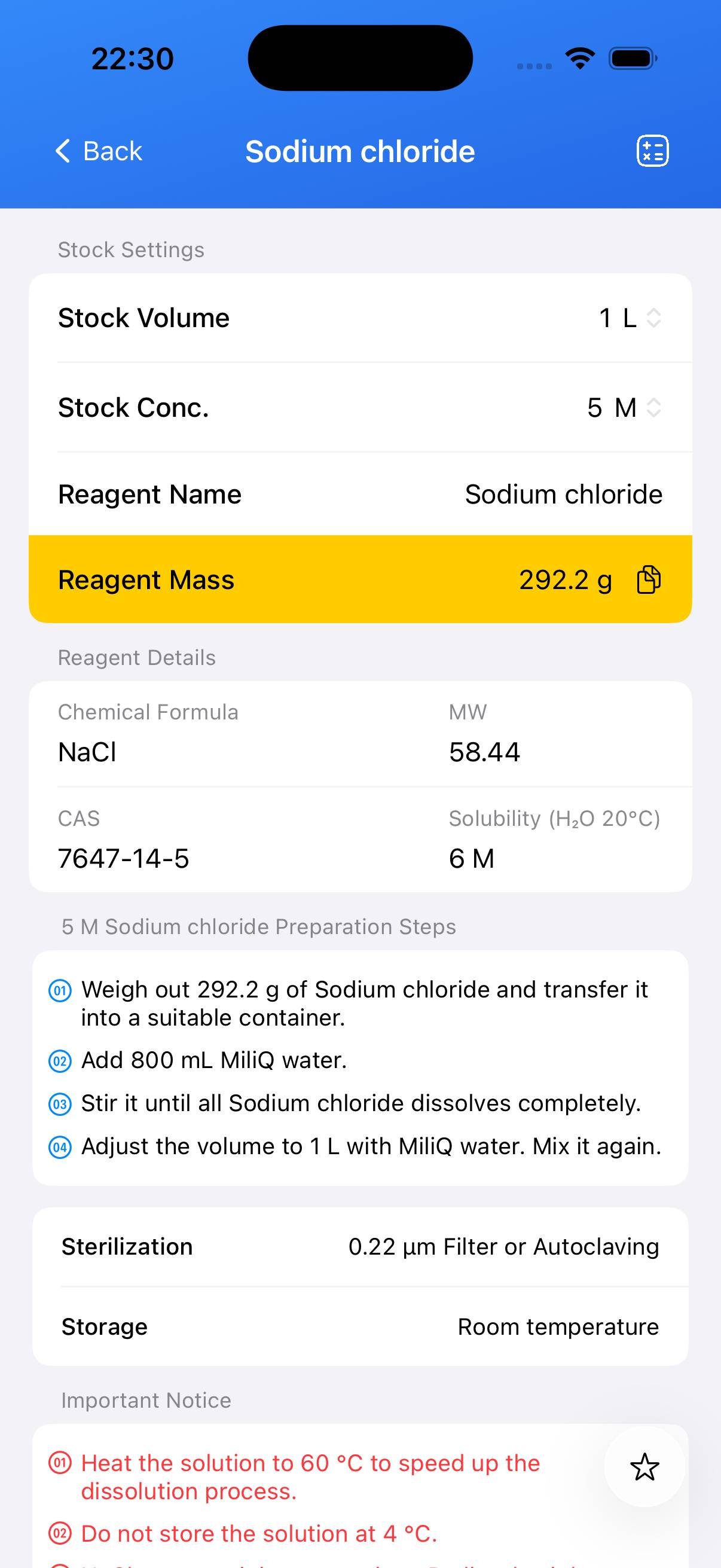- Cap and mix the solution thoroughly; the 1 M NaCl stock is now ready for use.