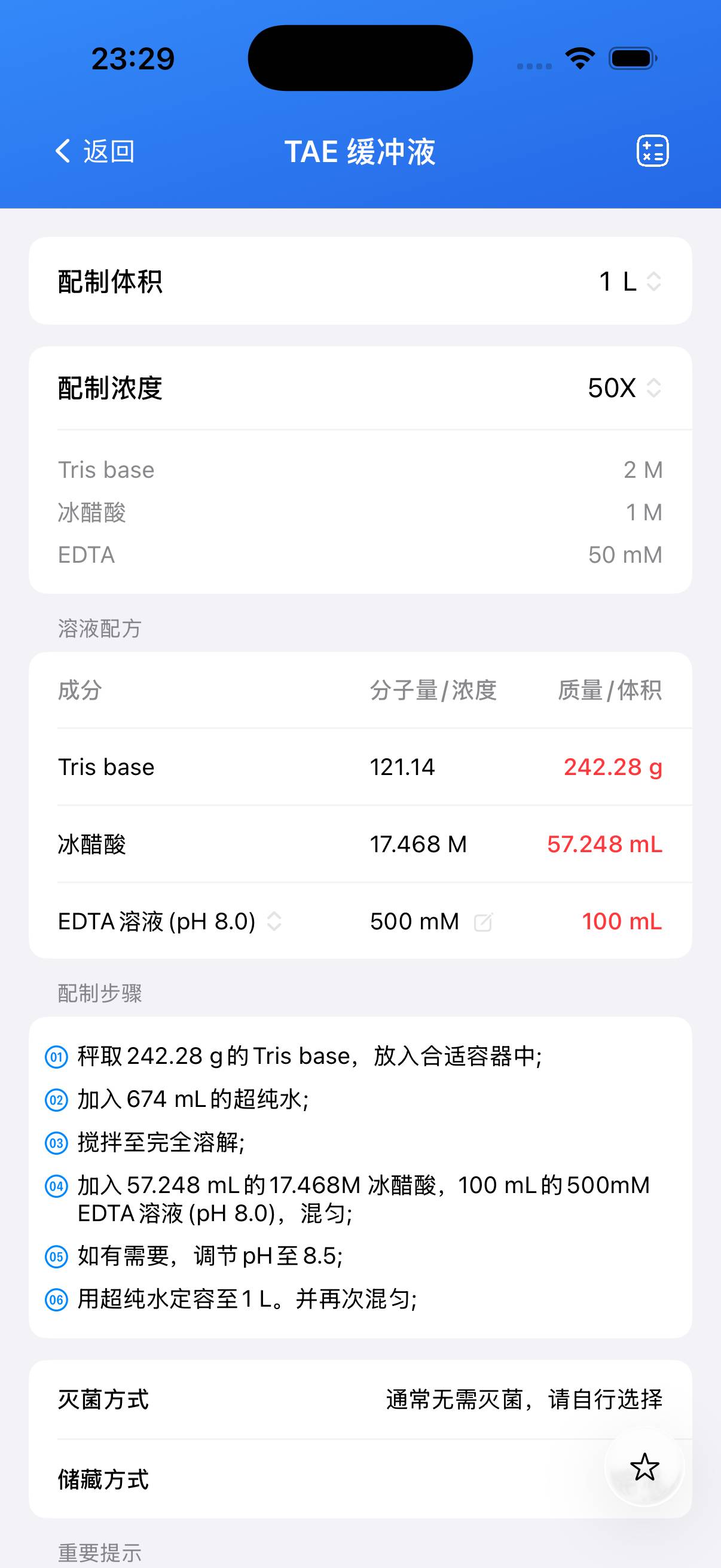 - EDTA(游离酸)极难溶解(需 pH 8.0),建议先配制 EDTA 储备液;