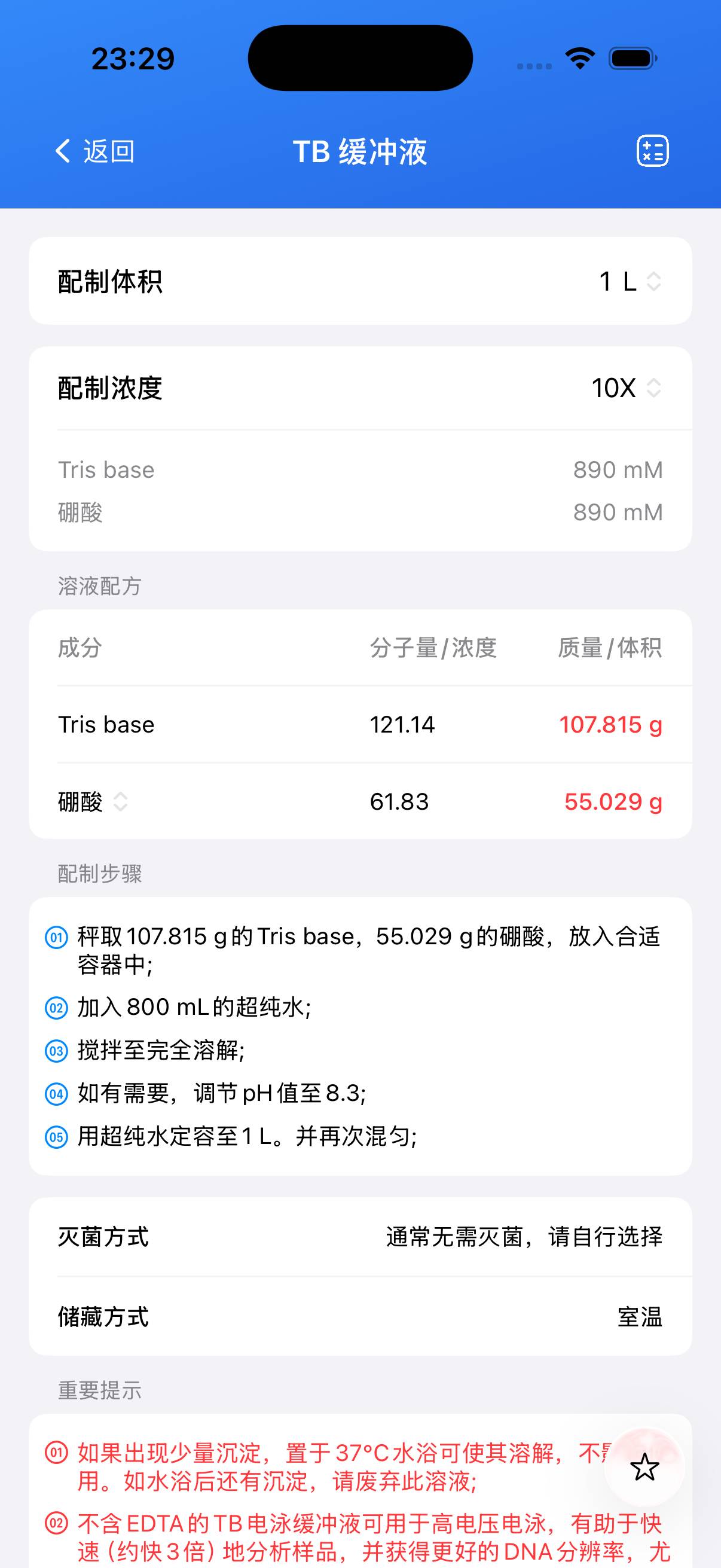 Tris-Borate(TB)缓冲液 —— 1X 工作液成分