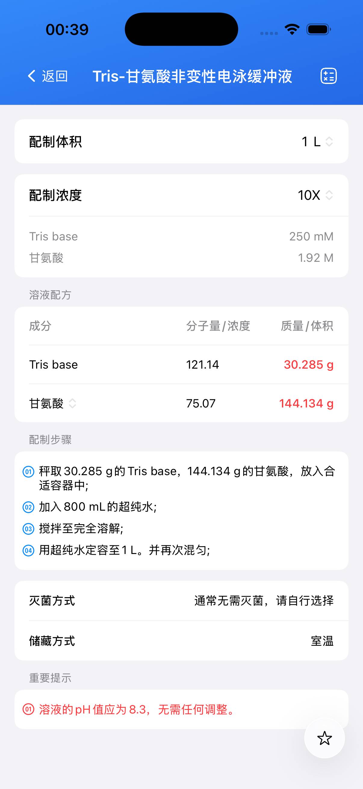 - 溶液的 pH 值应为 8.3,无需进行任何调整;