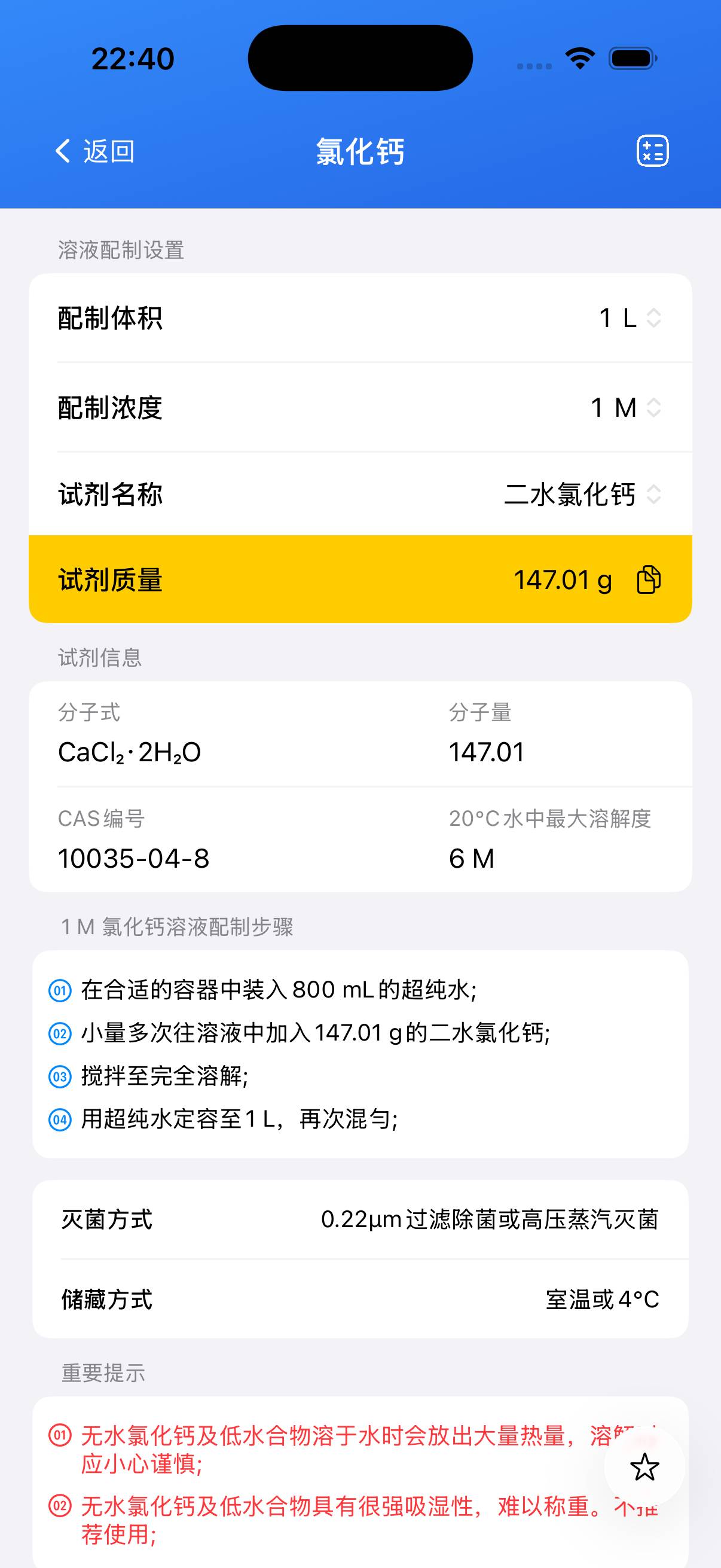 - 无水氯化钙易吸湿,建议使用水合物制备溶液。
