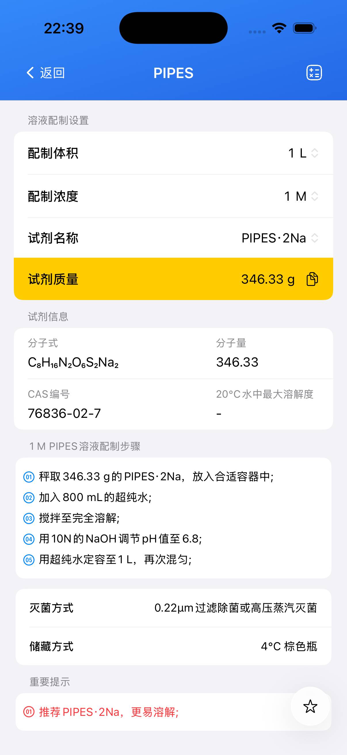 - 常见盐形式:PIPES·2Na、PIPES·Na、PIPES·1.5Na、PIPES(游离酸)