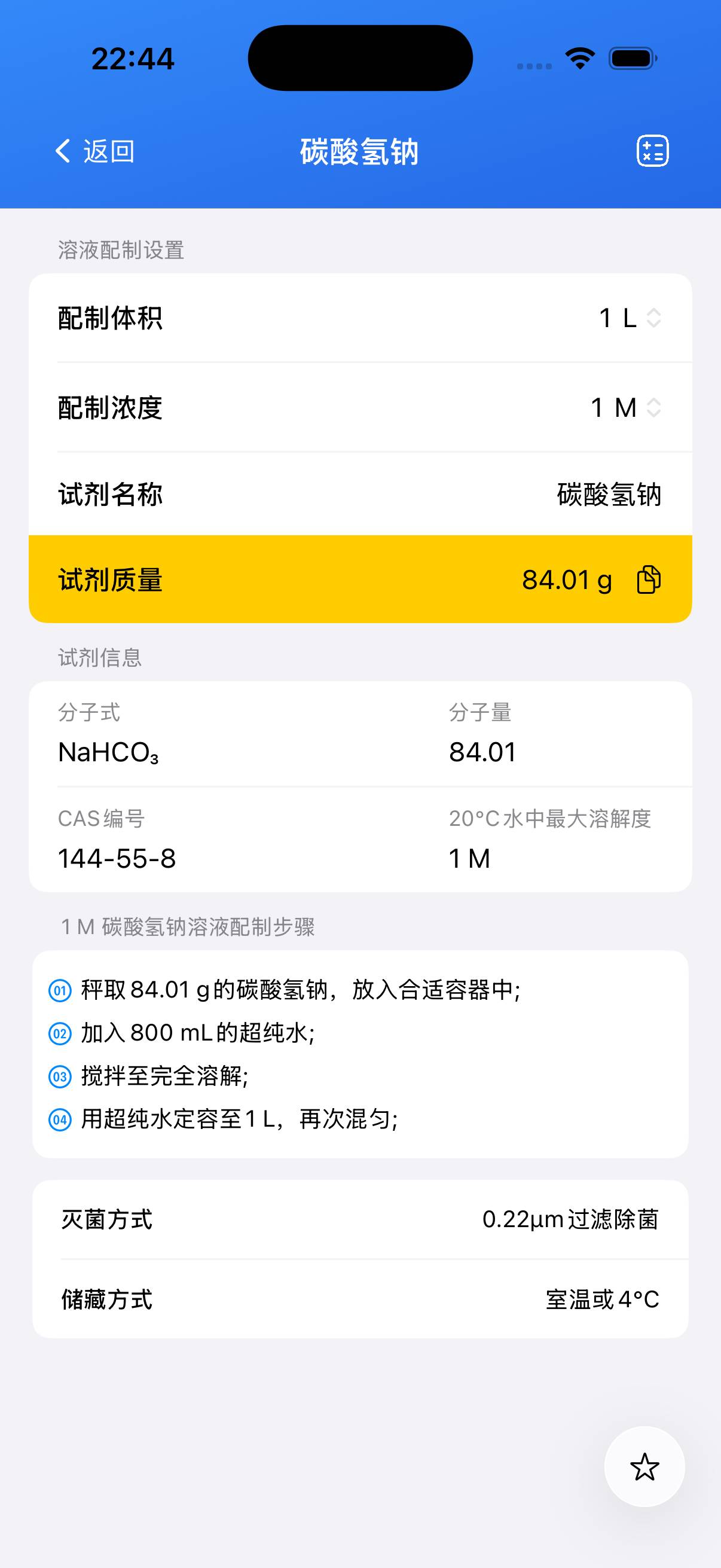 确定目标浓度。配制 1 M 溶液时,精确称取 **84.01 g** 碳酸氢钠。 - 步骤2