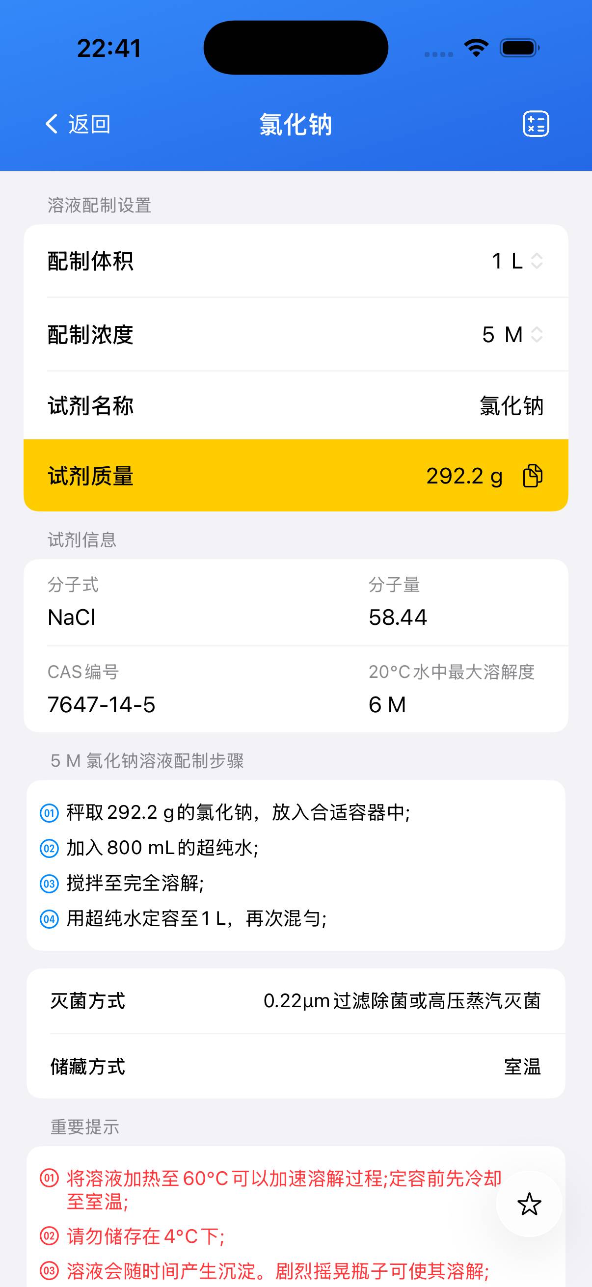 - 盖上容器并混合均匀,即可得到 1 M NaCl 储备液。