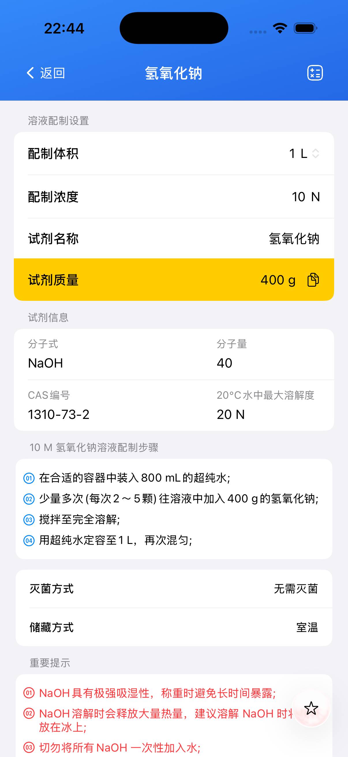 配制 100 mL 10 M 溶液,准确称取 **40 g** 氢氧化钠固体。 - 步骤2