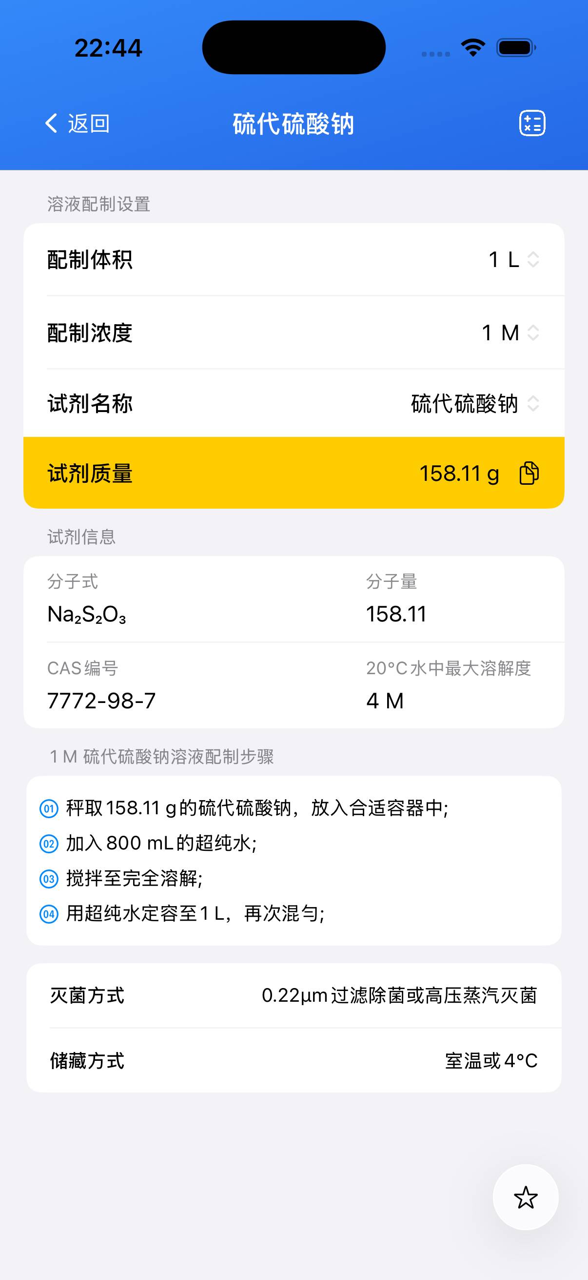 确定目标浓度。例如配制 0.1 M 溶液:使用五水合硫代硫酸钠时,称取约 **25 g Na₂S₂O₃·5H₂O 溶解至 1 L**;若使用无水形式,则按等量摩尔换算称取较低质量(约 **16 g**)。 - 步骤2