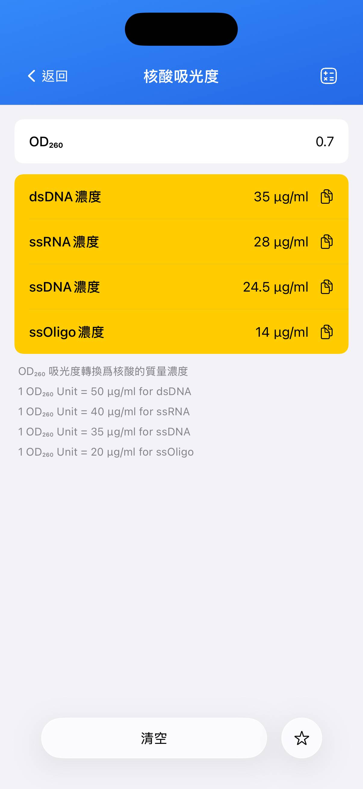 一個簡單的小工具,可根據 OD260 吸光度計算核酸濃度。