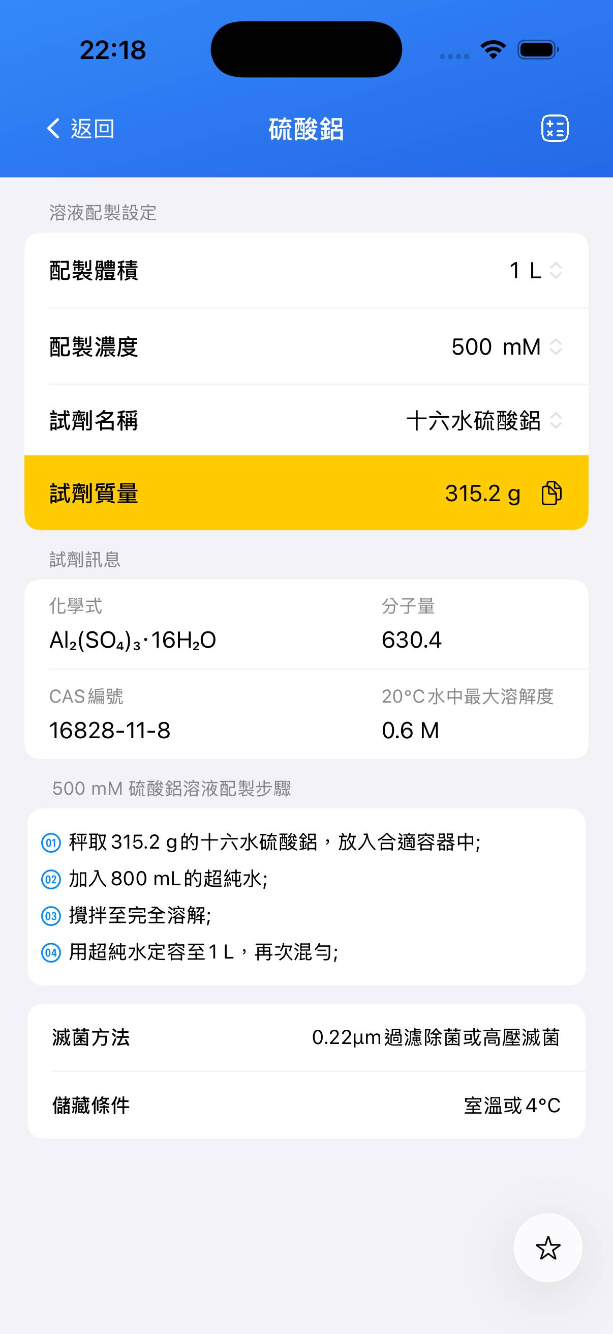 例如配製 1 L 1 M 溶液,準確稱取 **666.44 g** 十八水合硫酸鋁。 - 步驟2