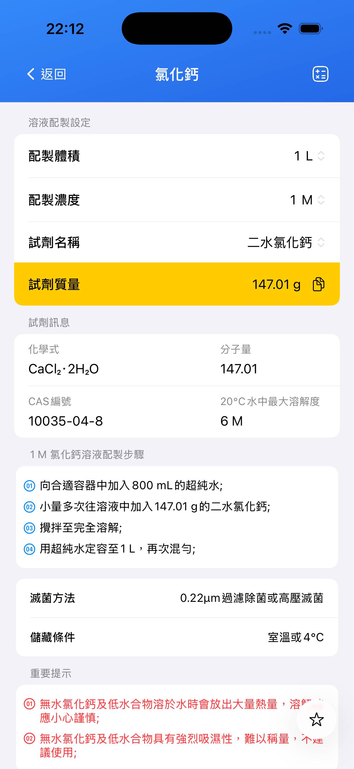 - 所得溶液應為透明無色,該 1 M 儲備液可用於配製培養基和含鈣溶液等用途。