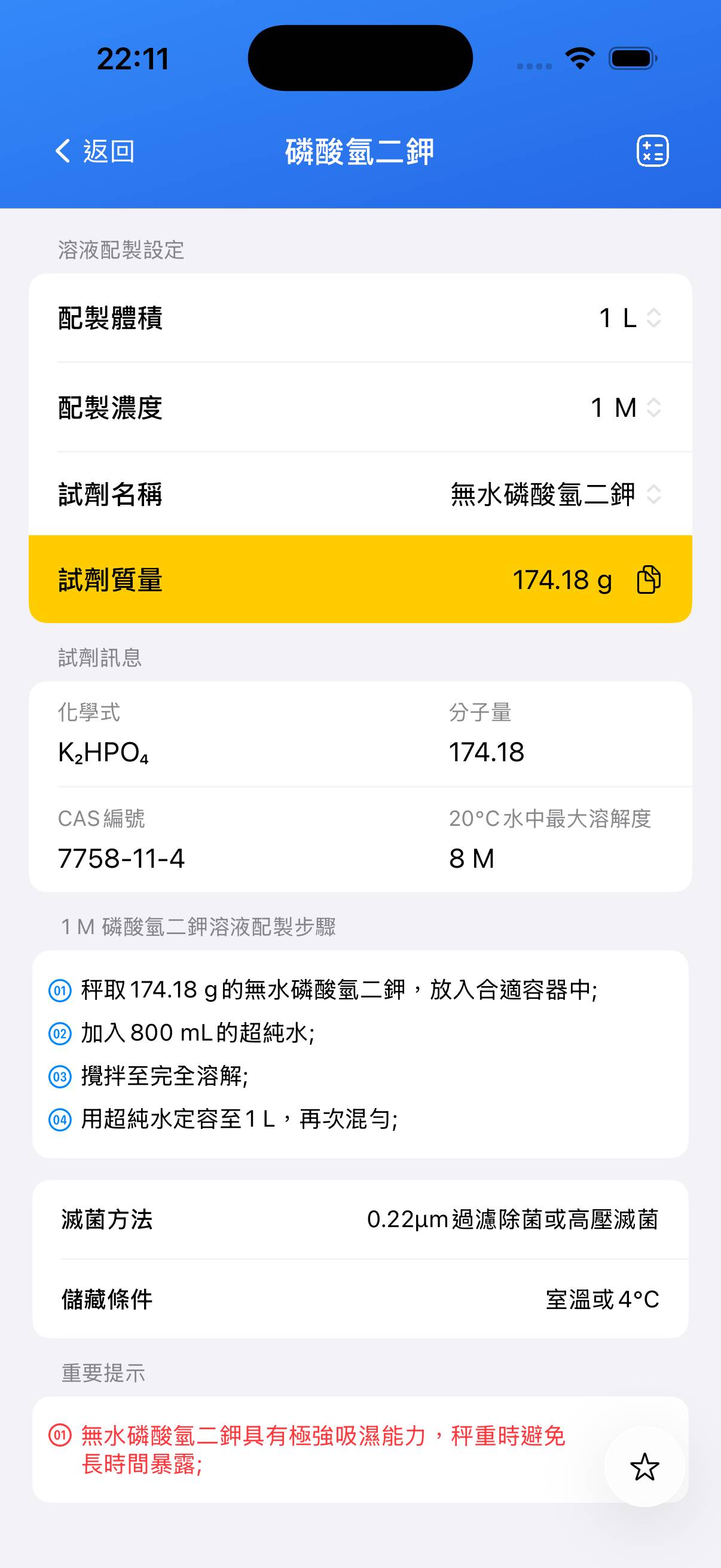- 所得溶液應為澄清無色。該 1 M 儲備液可直接使用或與其他磷酸鹽儲備液混合按需配製特定 pH 的緩衝液。