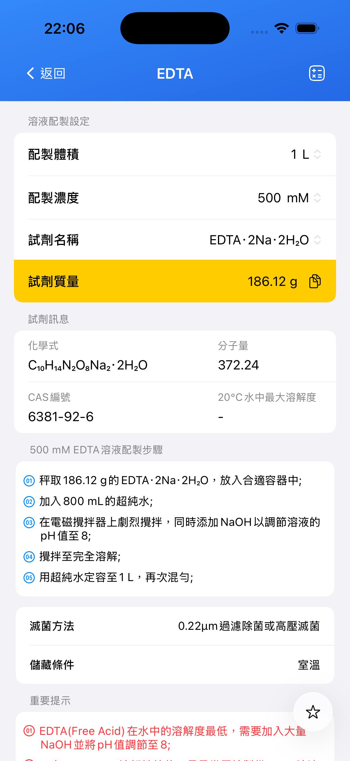 在水中的溶解度最低,通常需要加入大量 NaOH(約 3.1 當量)將 pH 調整至 8.0 才能完全溶解。 - EDTA 二鈉二水合物