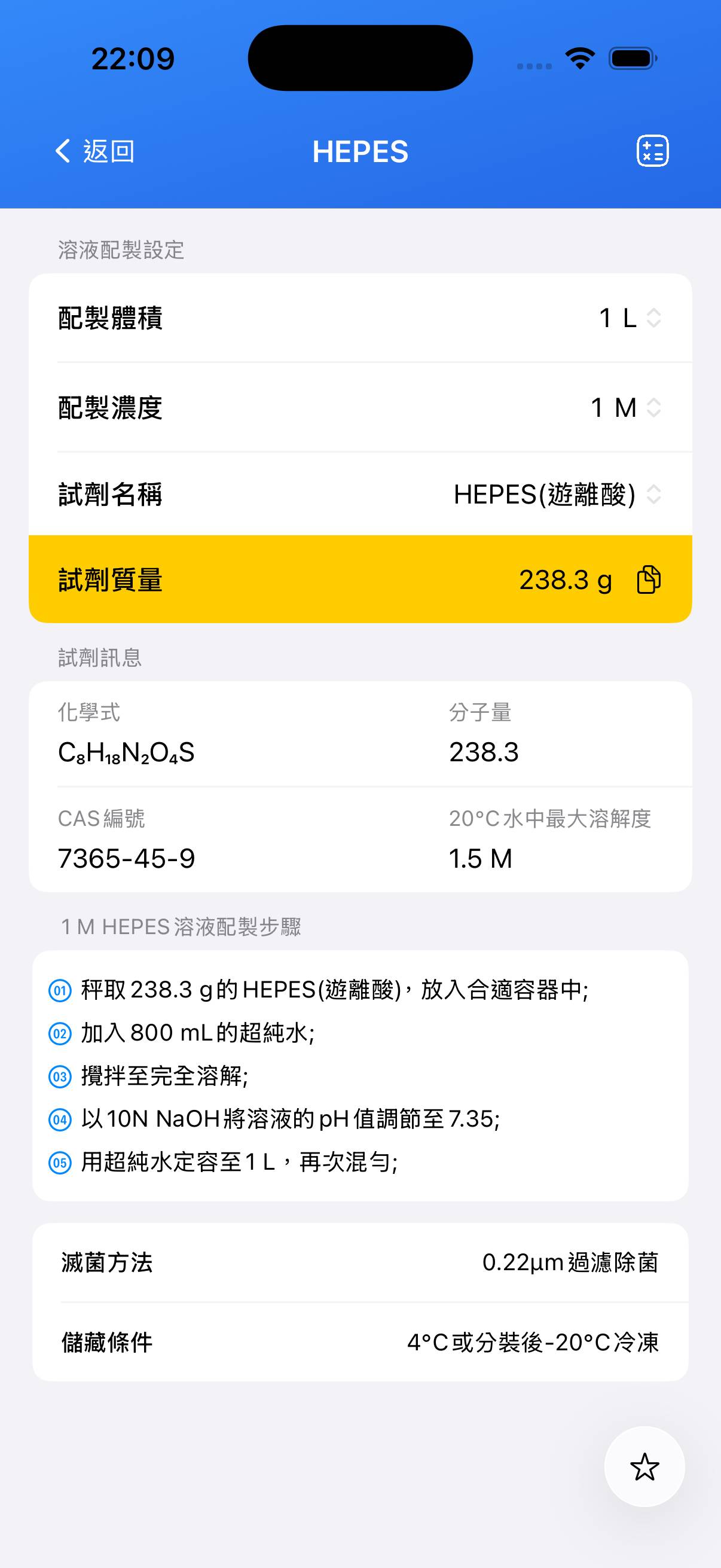 - 稱取 238.30 g HEPES(遊離酸)。