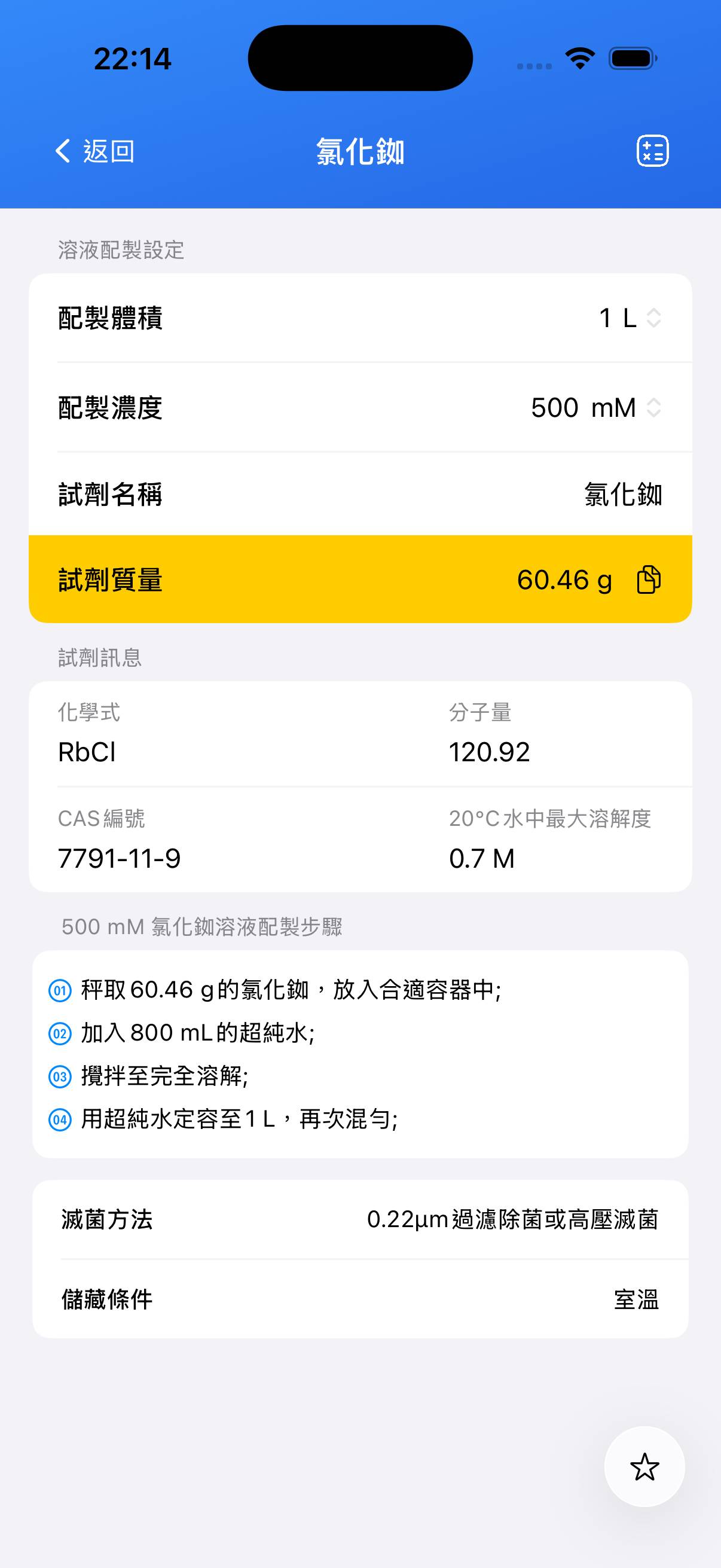 配製 100 mL、0.5 M 氯化銣水溶液。