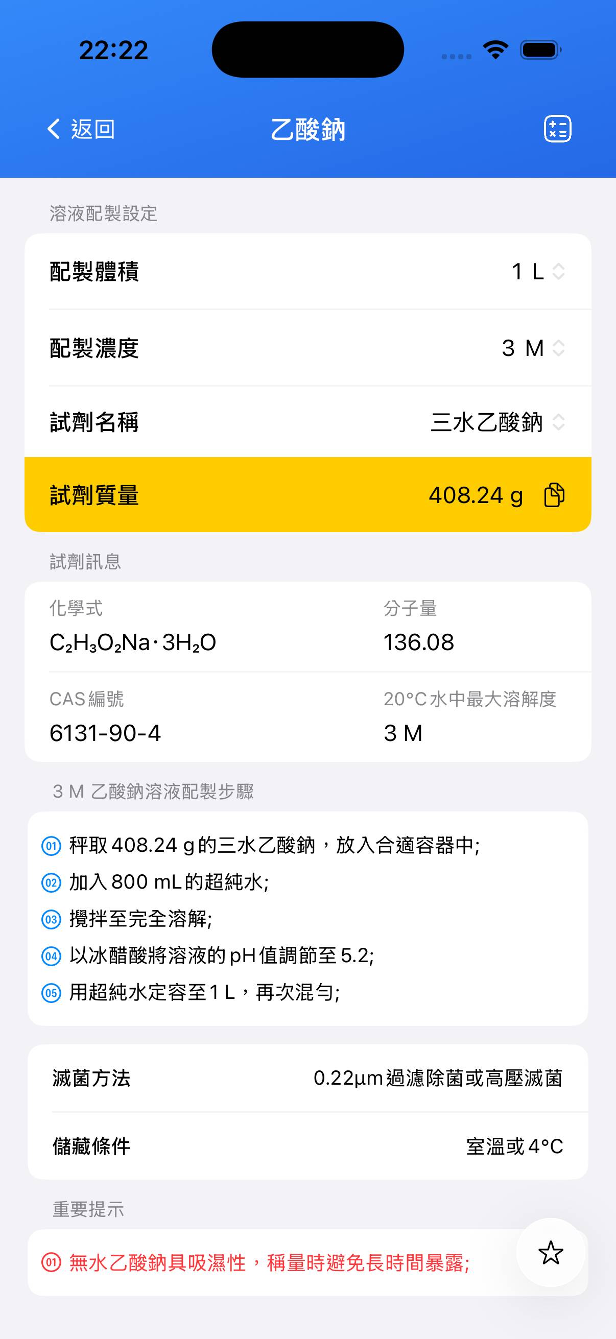 注意:無水乙酸鈉易吸濕,不易準確稱量,建議使用三水形式。請在容器上清晰標示濃度、pH 和製備日期,並密封保存。